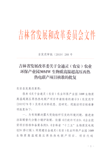 2019年11月11日,吉林省發(fā)改委發(fā)布了《關(guān)于金通靈(農(nóng)安)農(nóng)業(yè)環(huán)保產(chǎn)業(yè)園30MW生物質(zhì)高溫超高壓再熱熱電聯(lián)產(chǎn)項(xiàng)目申請核...