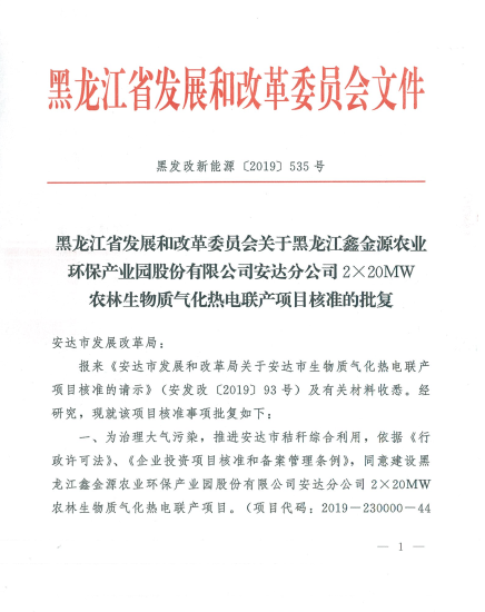 近日,黑龍江省發(fā)改委發(fā)布了《黑龍江省發(fā)展和改革委員會(huì)關(guān)于黑龍江鑫金源農(nóng)業(yè)環(huán)保產(chǎn)業(yè)園股份有限公司安達(dá)分公司2×20M...