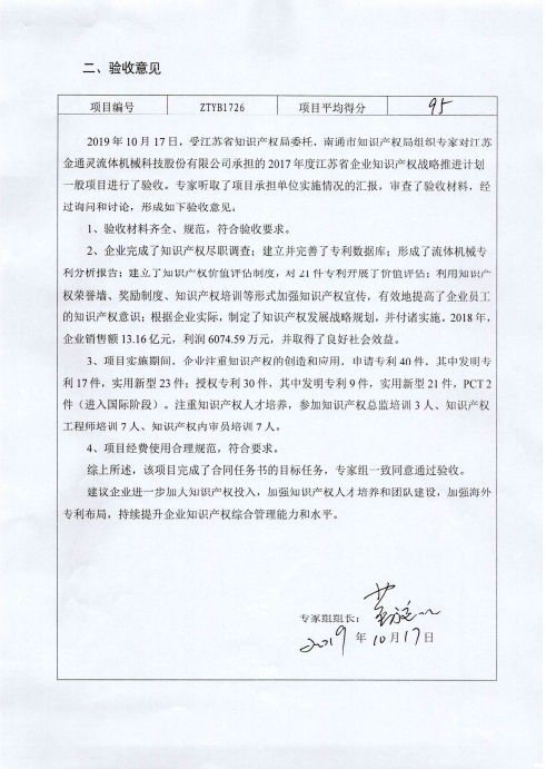 2019年10月17日,根據(jù)《省知識產(chǎn)權(quán)局關(guān)于開展省企業(yè)知識產(chǎn)權(quán)戰(zhàn)略推進(jìn)計(jì)劃2017年立項(xiàng)項(xiàng)目驗(yàn)收的通知》和《江蘇省知識產(chǎn)...